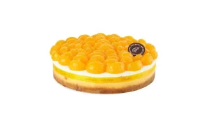 Cremoso cheesecake de mandarina, horneado sobre una base de miga de galleta coronado con una…